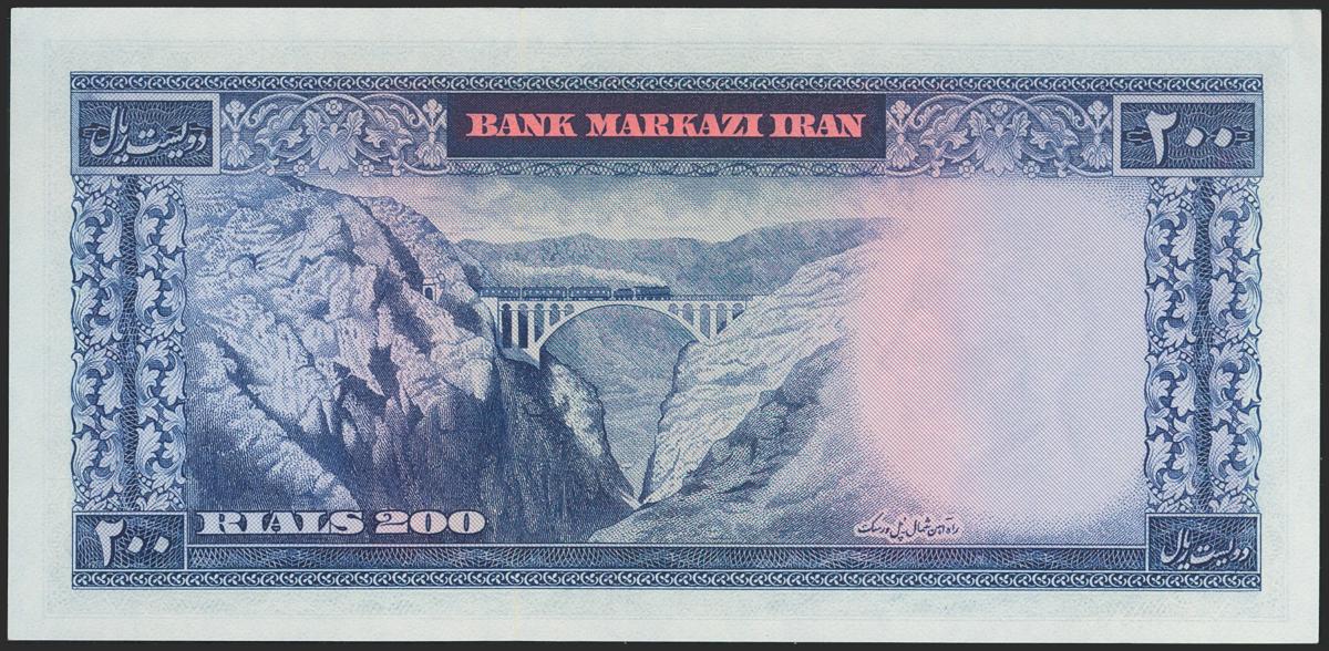 IRAN. 200 Rials. (1969ca). National Bank. Signatures: Samii and Amouzegar, dark panel. (Pick: 87a). Minor mishandling on top left corner. Uncirculated.