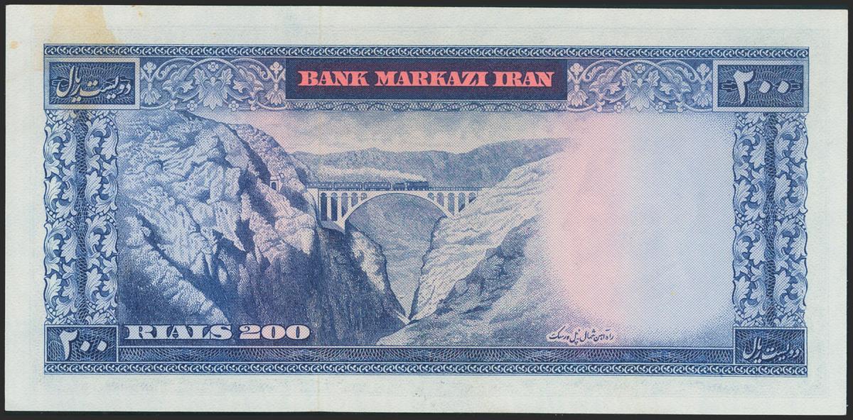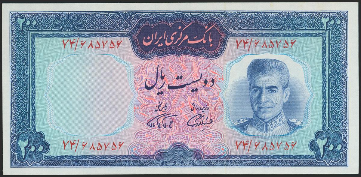 IRAN. 200 Rials. (1969ca). National Bank. Signatures: Famanfarmaian and Amouzegar, dark panel. (Pick: 87b). About uncirculated.