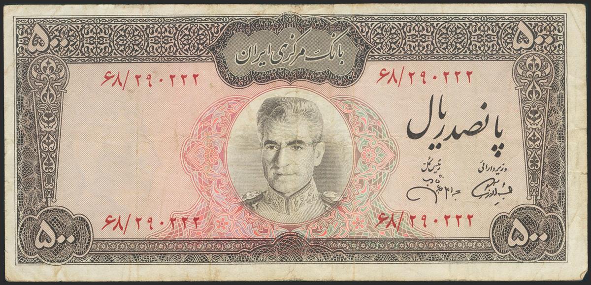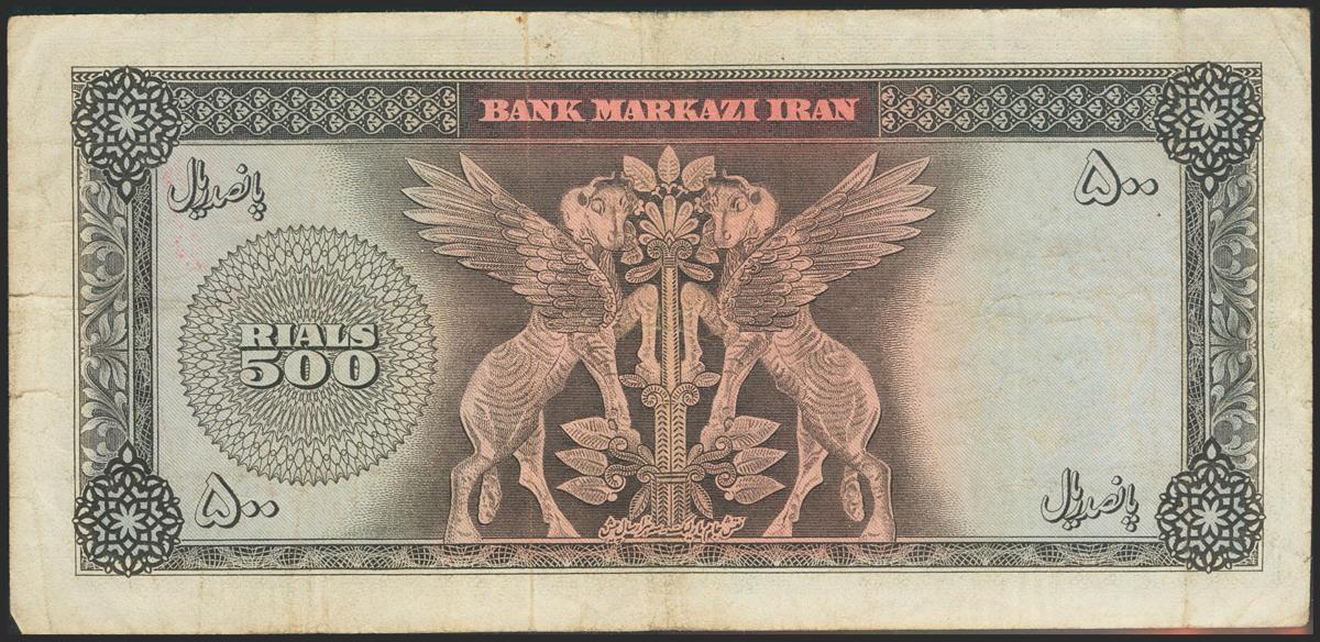 IRAN. 500 Rials. 1971-1973. National Bank. (Pick: 93c). Small tears on margins, not affecting design and pinholes. Scarce. Fine.