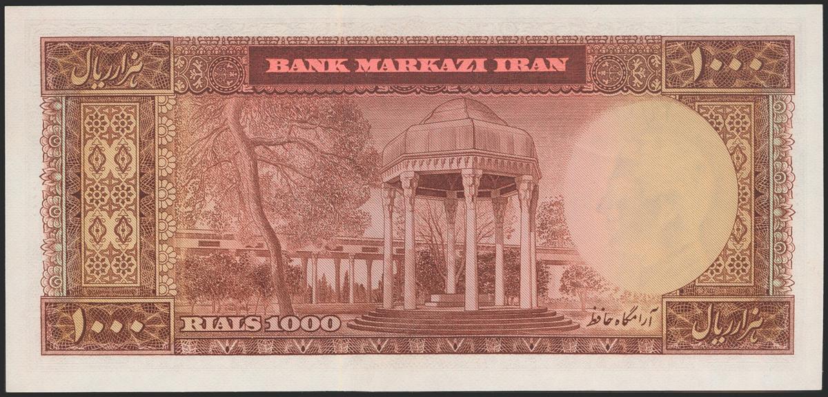 IRAN. 1000 Rials. (1971ca). National Bank. Signatures: Famanfarmaian and Amouzegar, light panel. (Pick: 94b). Small signs of mishandling. Uncirculated.