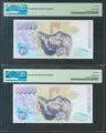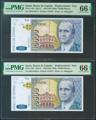 10000 Pesetas. 12 de Octubre de 1992. Pareja correlativa. Serie especial 9B. (Edifil 2021: 485b, Pick: 166*). Rarísima en esta excepcional calidad, apresto original. SC. Encapsulado PMG66EPQ, ambos.