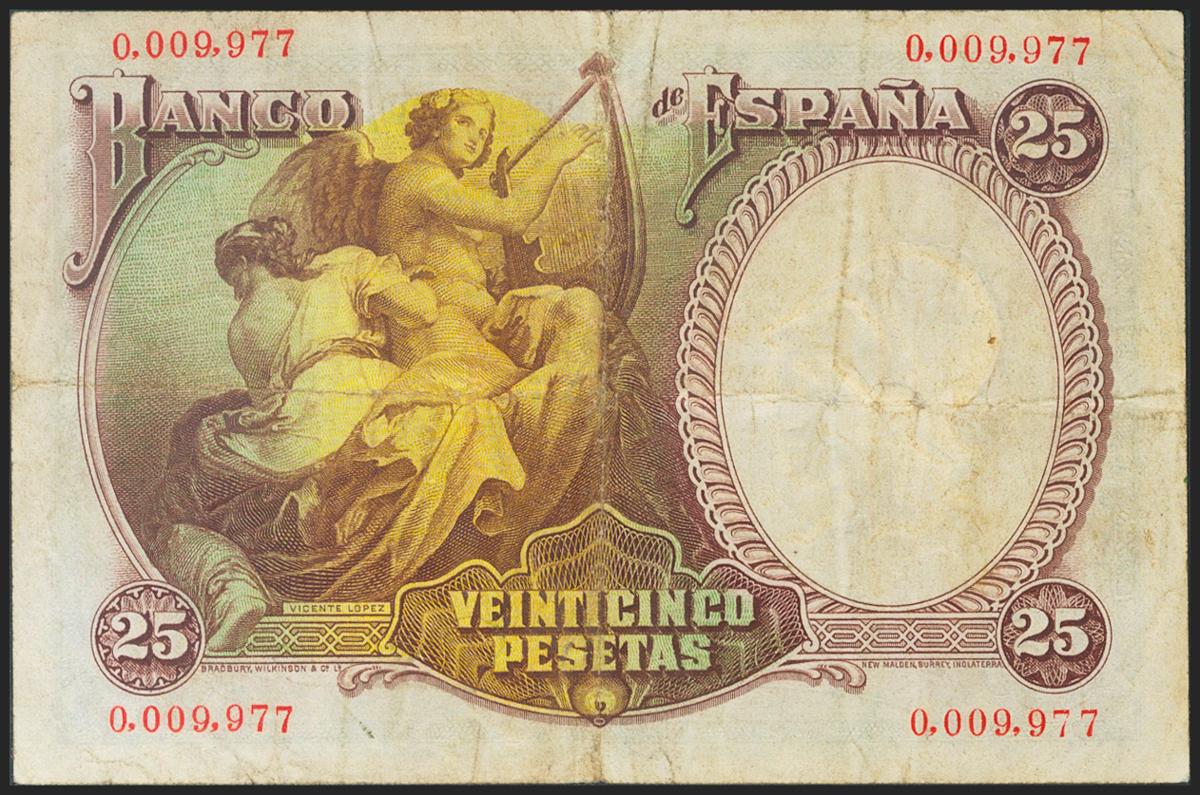 25 Pesetas. 25 de Abril de 1931. Sin serie y numeración bajísima. (Edifil 2021: 358). MBC.