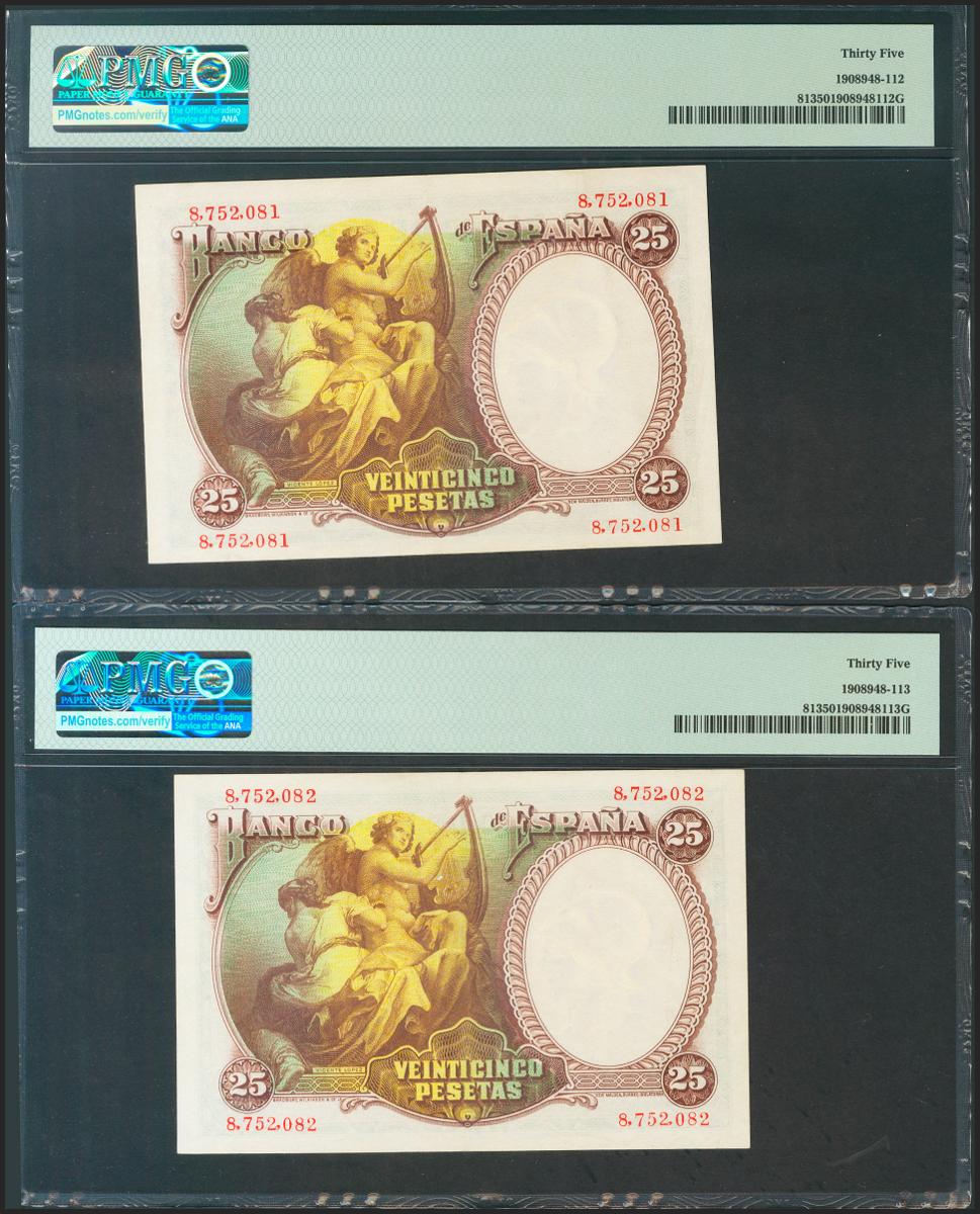 25 Pesetas. 25 de Abril de 1931. Pareja correlativa. Sin serie. (Edifil 2021: 358, Pick: 81). Inusual. EBC-. Encapsulado PMG35, ambos.