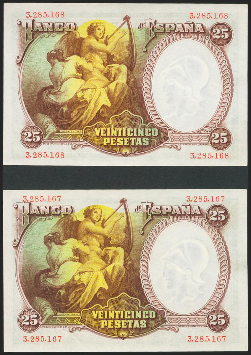 25 Pesetas. 25 de Abril de 1931. Pareja correlativa. Sin serie. (Edifil 2021: 358). Conserva gran parte del apresto original. SC-.