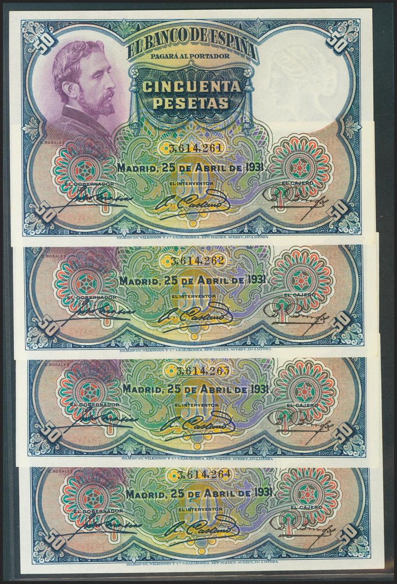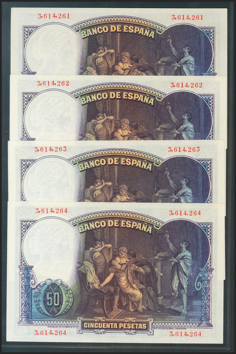 Conjunto de 4 billetes de 50 Pesetas todos correlativos sin serie (Edifil 2021: 358), conservan el apresto original. EBC+. (nos hacen llegar fotografía de estos billetes con un doblez-ondulación que no rompía fibra antes de ser ofrecidos en nuestra subasta y que ahora no observamos, por lo que tenemos que resaltar por un lado que los billetes han sido planchados, pero por otro lado también nos vemos obligados a remarcar que los billetes tienen un magnífico apresto original, y la rareza de encontrar 4 billetes consecutivos). Agradecemos toda la información que se nos hace llegar, mucha de ella en foros particulares de la que no tenemos acceso, recordamos nuestra posición en contra de manipulaciones, falsificaciones, etc, el grupo Iberphil-Ibercoin participa y colabora activamente en comités de expertos, la sensibilidad que dentro de nuestra compañía hay contra estas malas artes es total, aceptamos la restauración, embellecimiento de la piezas, pero sólo en el caso de que el cliente esté debidamente informado de ello.