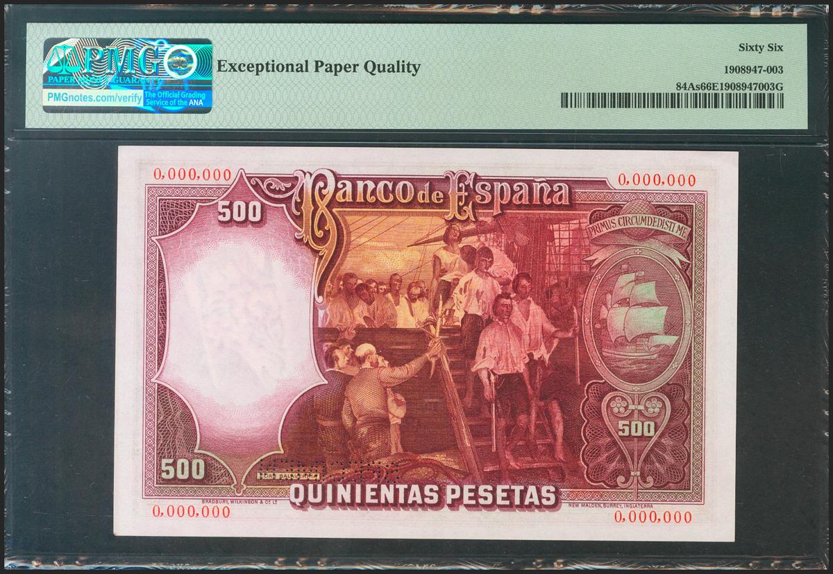 500 Pesetas. 25 de Abril de 1931. Numeración 0.000.000, taladrado SPECIMEN en el lugar destinado a la firma del cajero. (Edifil 2021: 361M, Pick: 84As). Rarísimo, además de una excepcional calidad y apresto original. SC. Encapsulado PMG66EPQ.