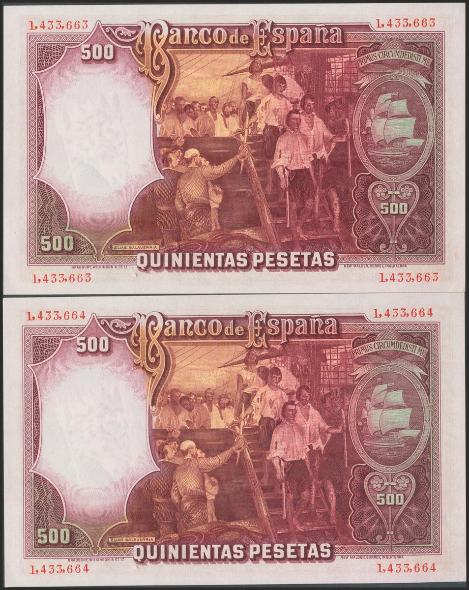 500 Pesetas. 24 de Abril de 1931. Pareja correlativa. Sin serie. (Edifil 2017: 361). Apresto original. EBC++.