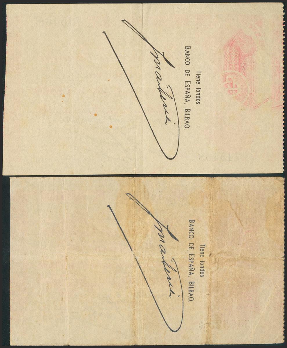 Conjunto de 2 billetes de 5 Pesetas emitidos el 30 de Agosto de 1936 de la sucursal de Bilbao, ambos con la antefirma Banco de Vizcaya, sin serie y serie A, respectivamente. (Edifil 2021: 368a, 368Aa). EBC+.