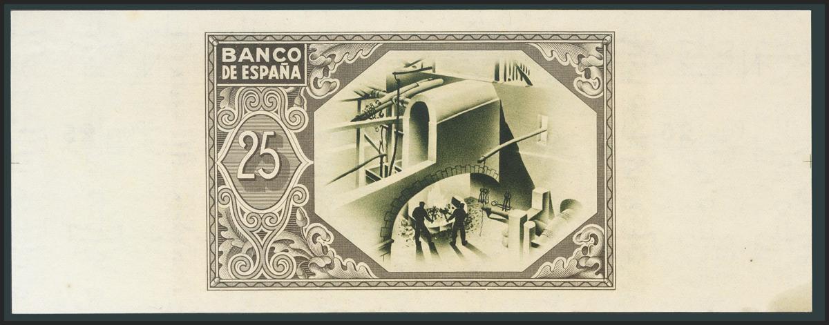 25 Pesetas. 1 de Enero de 1937. Sucursal de Bilbao, antefirma Caja de Ahorros Vizcaína. Sin serie y sin numeración, con ambas matrices. (Edifil 2017: 388a). EBC+.