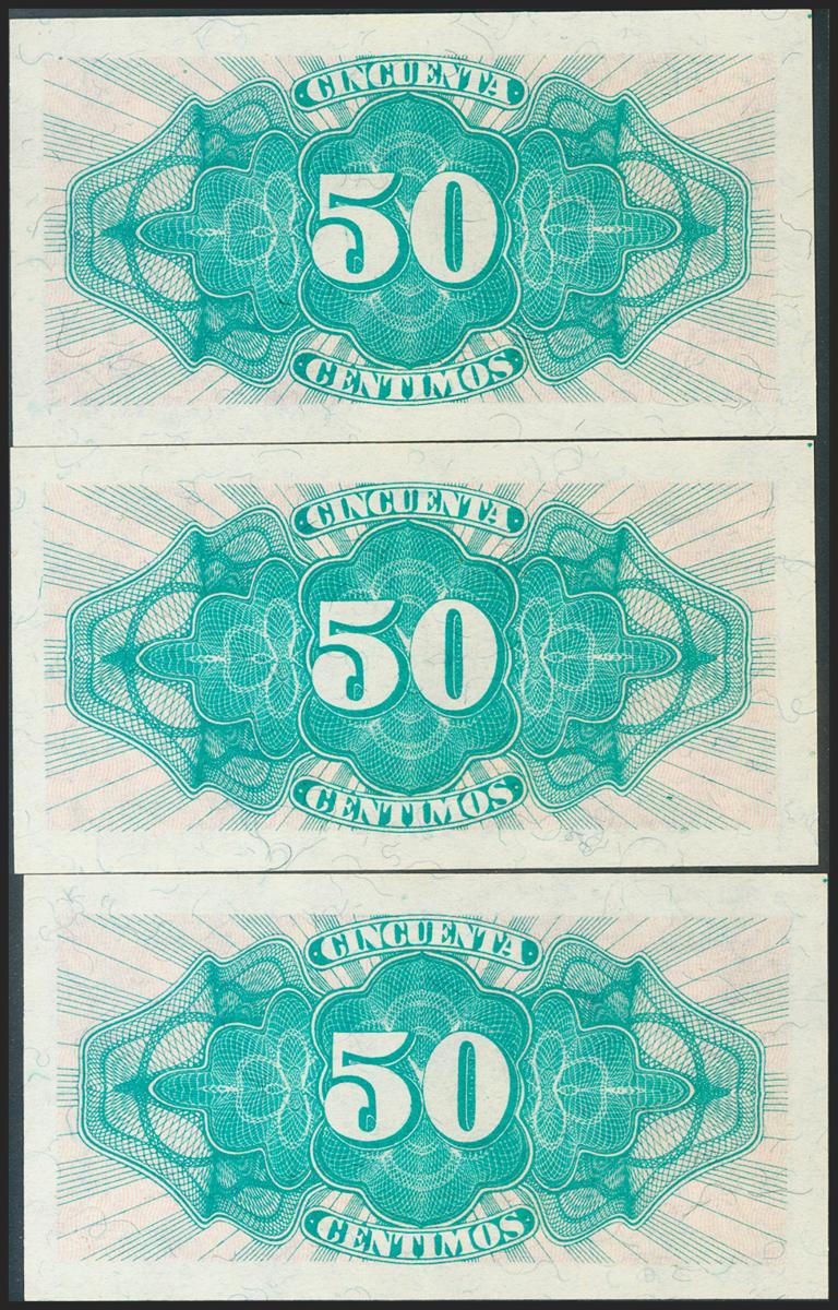 50 Céntimos. 1937. Trío correlativo. Serie B. (Edifil 2021: 391). Apresto original. SC.
