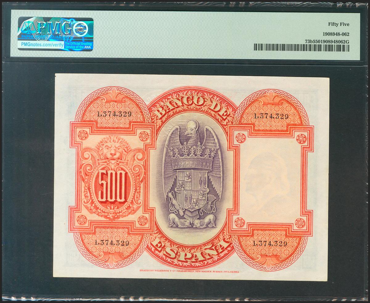 500 Pesetas. 24 de Julio de 1927. Sin serie, numeración anterior al 1602000 y sello en seco ESTADO ESPAÑOL / BURGOS. (Edifil 2021: 413, Pick: 73b). Inusual en esta calidad. EBC+. Encapsulado PMG55.