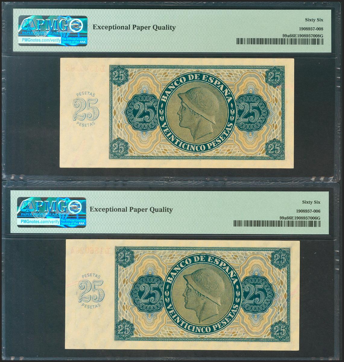 25 Pesetas. 21 de Noviembre de 1936. Pareja correlativa. Serie L. (Edifil 2021: 419a, Pick: 99a). Rara en esta calidad y con apresto original. SC. Encapsulado PMG66EPQ, ambos.