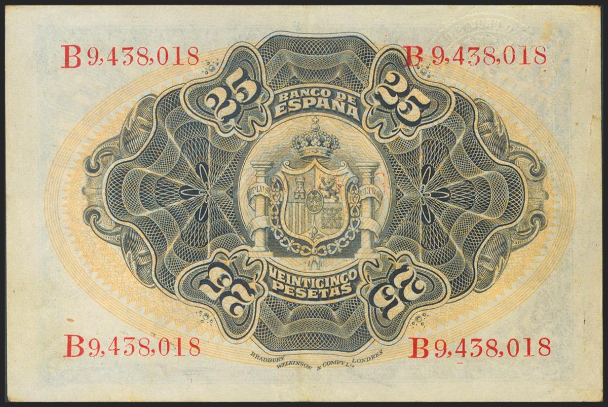 25 Pesetas. 24 de Septiembre de 1906. Sello en seco GOBIERNO PROVISIONAL DE LA REPUBLICA y serie B. (Edifil 2021: 333). MBC+.