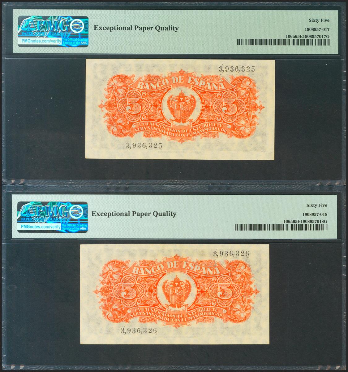 5 Pesetas. 18 de Julio de 1937. Pareja correlativa. Sin serie. (Edifil 2021: 424a, Pick: 106a). Rara pareja en esta calidad, apresto original. SC. Encapsulado PMG65EPQ, ambos.