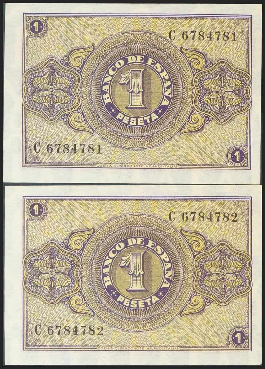 1 Peseta. 12 de Octubre de 1937. Pareja correlativa. Serie C. (Edifil 2021: 425a). Apresto original. SC-.