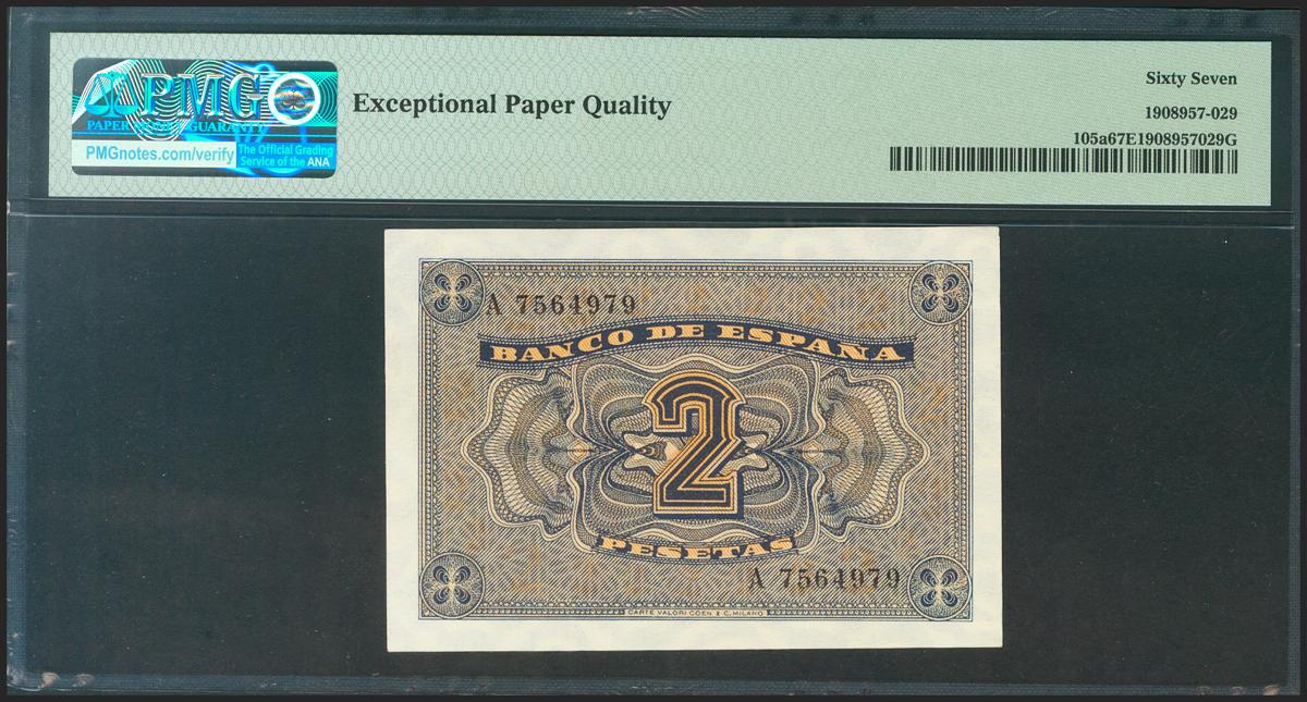 2 Pesetas. 12 de Octubre de 1937. Serie A. (Edifil 2021: 426, Pick: 105a). Rarísimo en esta calidad, apresto original. SC. Encapsulado PMG67EPQ.