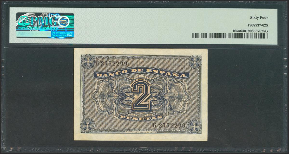 2 Pesetas. 12 de Octubre de 1937. Serie B. (Edifil 2017: 426a). SC. Encapsulado PMG64.