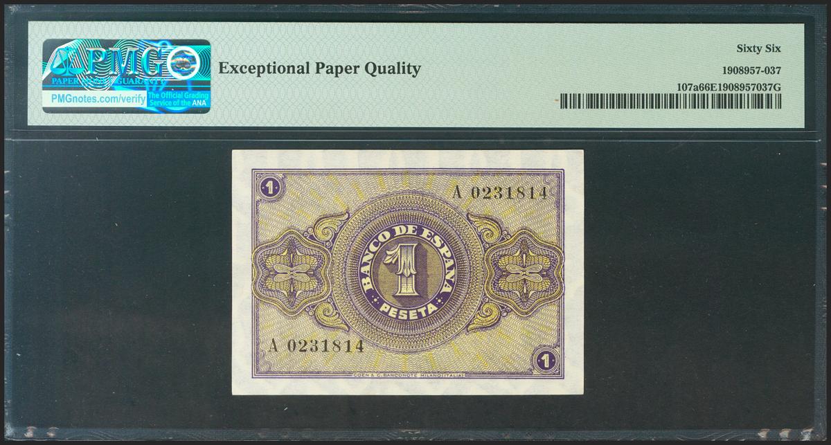 1 Pesetas. 28 de Febrero de 1938. Serie A. (Edifil 2021: 427, Pick: 107a). Inusual en esta calidad, apresto original. SC. Encapsulado PMG66EPQ.
