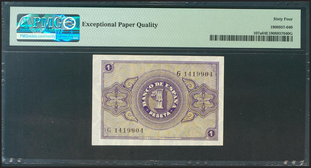 1 Pesetas. 28 de Febrero de 1938. Serie G. (Edifil 2021: 427a, Pick: 107a). Apresto original. SC. Encapsulado PMG64EPQ.