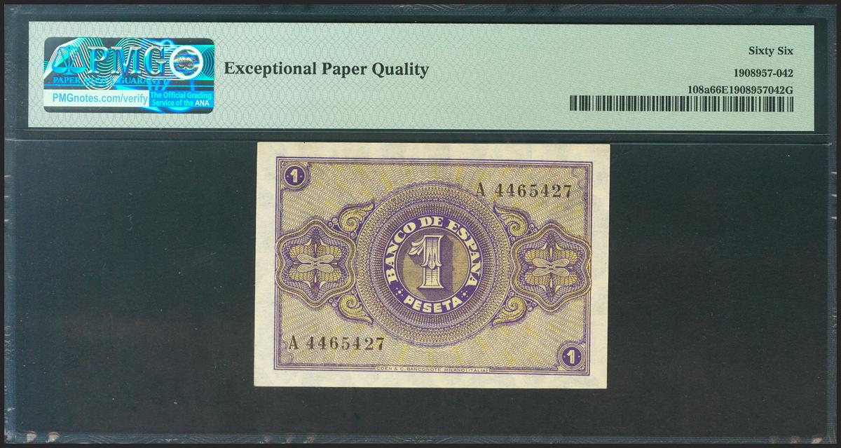 1 Pesetas. 30 de Abril de 1938. Serie A. (Edifil 2021: 428, Pick: 108a). Inusual en esta calidad, apresto original. SC. Encapsulado PMG66EPQ.
