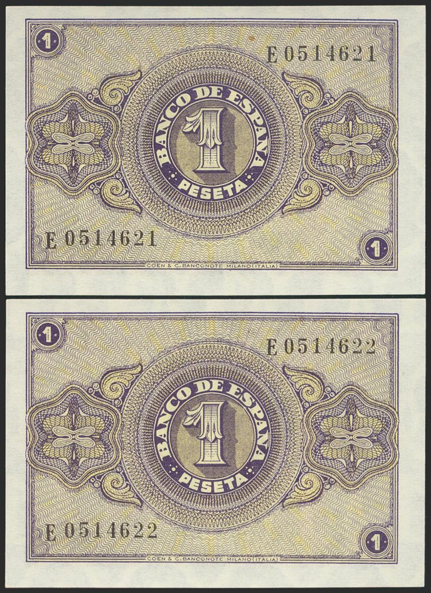 1 Peseta. 30 de Abril de 1938. Pareja correlativa. Serie E. (Edifil 2021: 428a). Apresto original. SC.