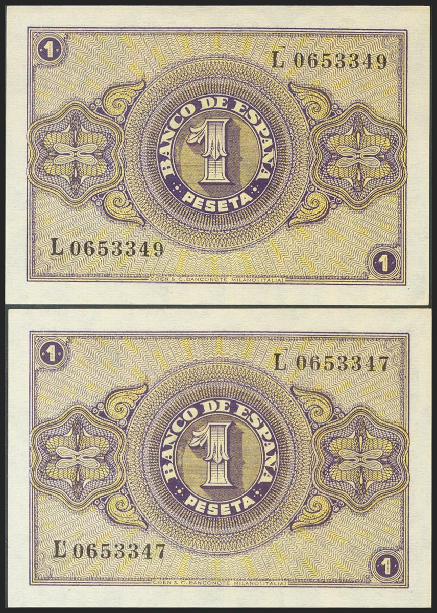 1 Peseta. 30 de Abril de 1938. Pareja correlativa. Serie L. (Edifil 2021: 428a). Apresto original. SC/SC-.