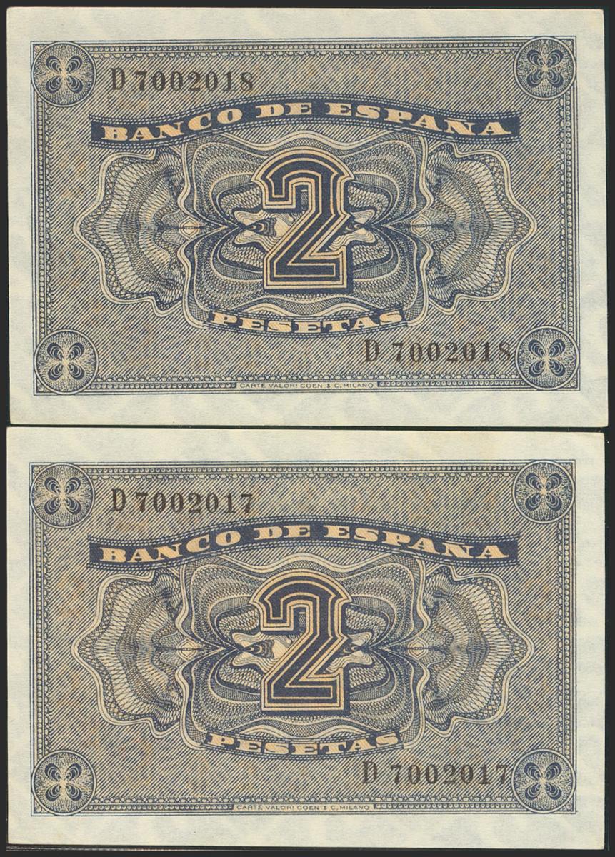 2 Pesetas. 30 de Abril de 1938. Pareja correlativa. Serie D. (Edifil 2021: 429a). Apresto original. SC-.