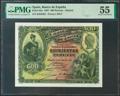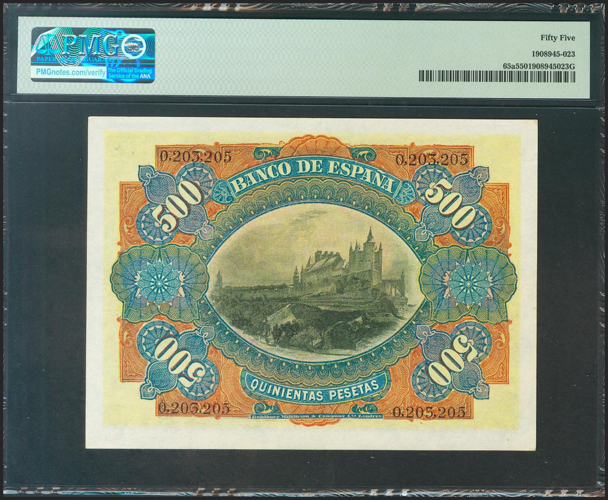 500 Pesetas. 15 de Julio de 1907. Sin serie. (Edifil 2021: 321, Pick: 65a). Rarísimo en esta calidad. EBC+. Encapsulado PMG55. (para hacernos idea de la rareza, a fecha 4 de Noviembre de 2021, este billete es el sexto mejor calificado junto a otros cuatro billetes en PMG)