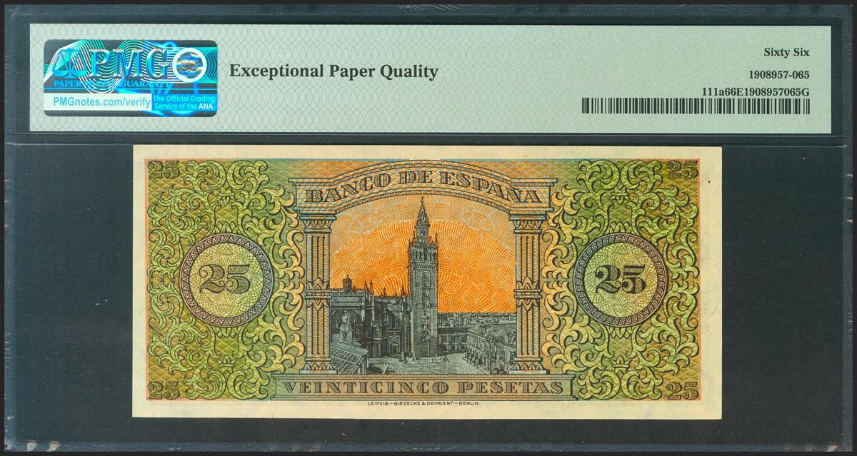 25 Pesetas. 20 de Mayo de 1938. Serie A. (Edifil 2021: 430, Pick: 111a). Inusual en esta calidad, apresto original. SC. Encapsulado PMG66EPQ.