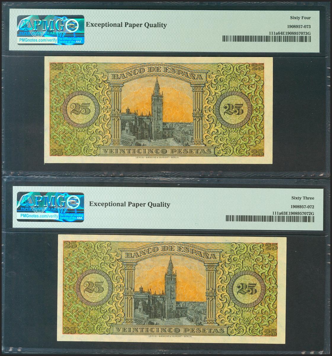 25 Pesetas. 20 de Mayo de 1938. Pareja correlativa. Serie C. (Edifil 2021: 430a, Pick: 111a). Inusual en esta calidad, apresto original. SC. Encapsulado PMG64EPQ/63EPQ.
