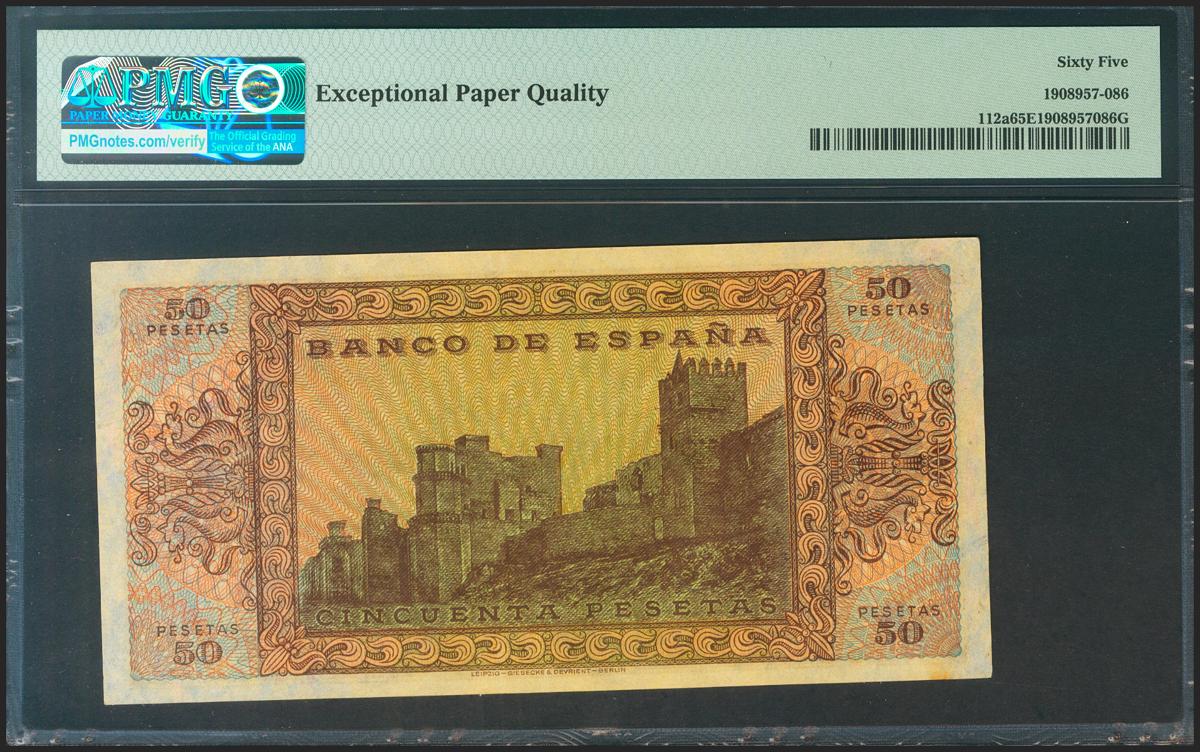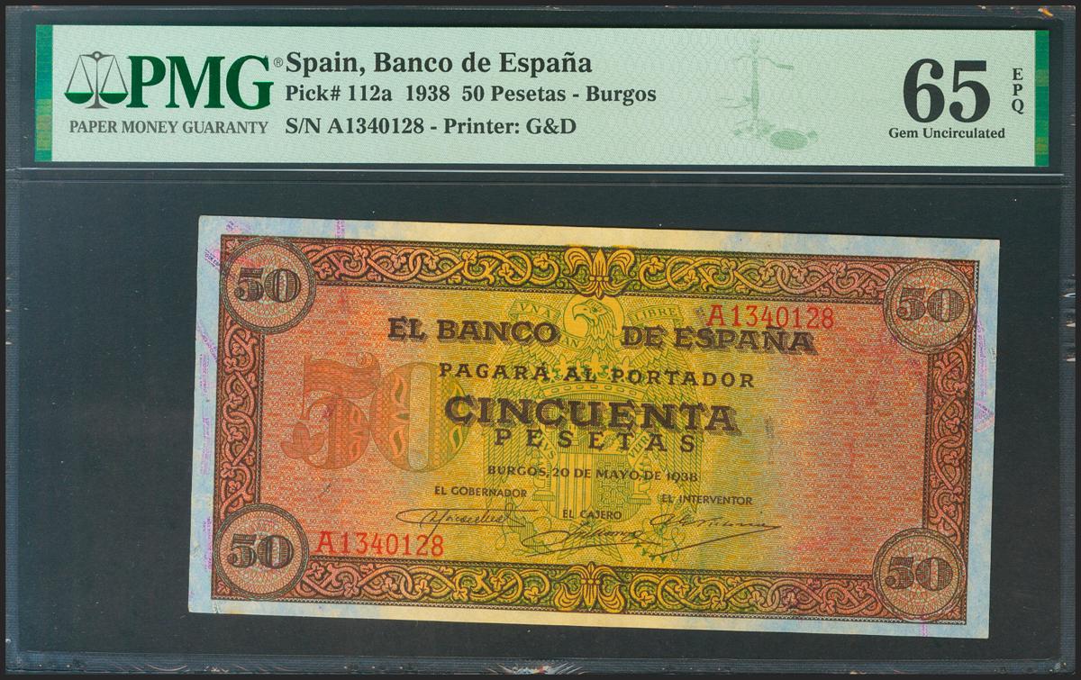 50 Pesetas. 20 de Mayo de 1938. Serie A. (Edifil 2021: 431, Pick: 112a). Raro en esta calidad, apresto original. SC. Encapsulado PMG65EPQ.