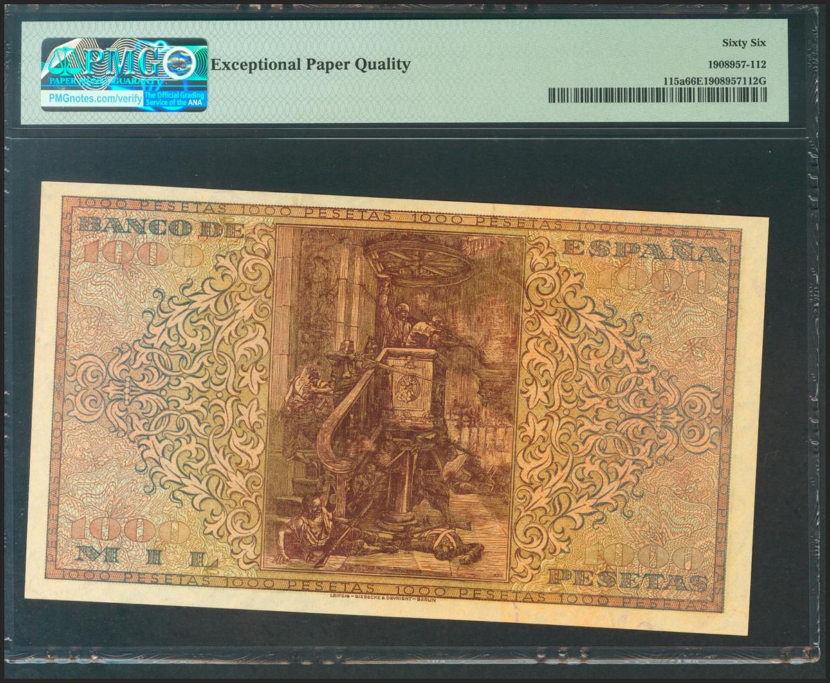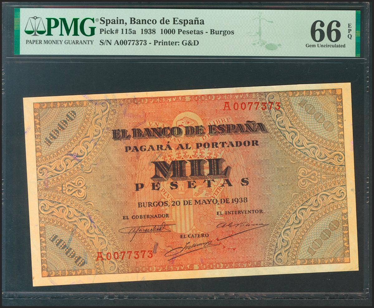 1000 Pesetas. 20 de Mayo de 1938. Serie A. (Edifil 2021: 434, Pick: 115a). Rarísimo, especialmente en esta calidad, apresto original. SC. Encapsulado PMG66EPQ. (para hacernos idea de la rareza, a fecha 4 de Noviembre de 2021, el billete se trata del mejor calificado junto a otros cinco billetes en PMG) (advertimos de la medida del billete 104 mm x 180 mm, sugiriendo la posibilidad de que el margen superior haya sido guillotinado, circunstancia que PMG no valora, en cualquier caso nos vemos obligados a resaltarlo y adecuar el precio de salida a dicha posibilidad)Nota informativa:Agradecemos toda la información que se nos hace llegar, mucha de ella en foros particulares a la que no tenemos acceso y somos informados de manera indirecta. Como no puede ser de otra manera, nos gustaría incidir en nuestra posición totalmente en contra de cualquier tipo de manipulación y/o falsificación hecha con el propósito de engañar. El grupo Iberphil-Ibercoin participa y colabora activamente en comités de expertos demostrando la sensibilidad que dentro de nuestra compañía hay contra estas malas artes. Aceptamos la restauración o el embellecimiento de la piezas, pero sólo en el caso de que el cliente esté debidamente informado de ello.A pesar de esta incidencia puntual, apoyamos la labor de PMG (muchos coleccionistas, y cada vez más, confían en su labor), ya que aun siendo conscientes de que no tienen la certeza absoluta, dan seguridad al mercado y animan a muchas personas a entrar en nuestro hobby, especialmente en piezas de importancia. Desde aquí nos atrevemos a pedir que no se banalice su posición, como también debemos respetar a los coleccionistas clásicos que no quieren encapsular sus billetes. Ibercoin no está ni en contra ni a favor de ninguna de las opciones, respetamos ambas y ofrecemos piezas de colección también de ambas maneras. Debemos de aprender a convivir con ambas opciones, es cierto que las cápsulas están atravesando su edad de oro, el futuro dirá si perdurará o no esta opción, pero la realidad es que a día de hoy la diferencia de precio en los remates de uno y otro modo, como norma general, es importante.