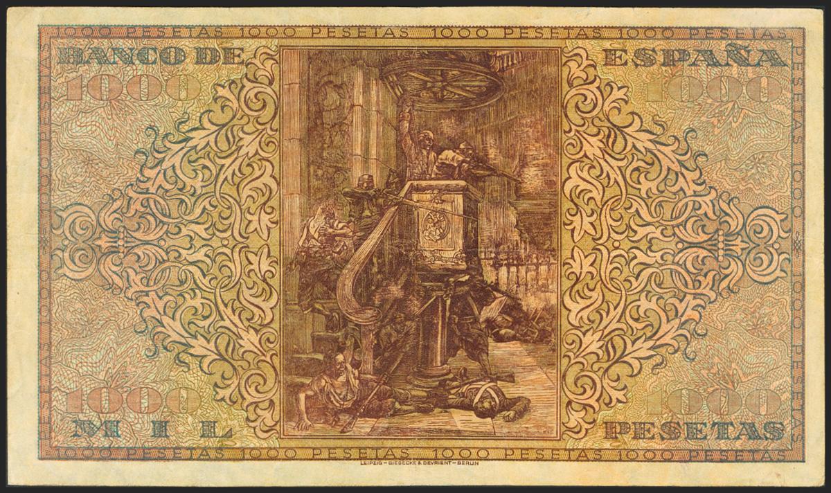 1000 Pesetas. 20 de Mayo de 1938. Serie A. (Edifil 2021: 434). Mínimamente reparado en el pliegue vertical, atractiva. MBC.