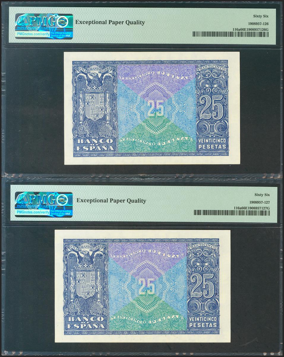 25 Pesetas. 9 de Enero de 1940. Pareja correlativa. Serie C. (Edifil 2021: 436a, Pick: 116a). Rara en esta calidad, apresto original. SC. Encapsulado PMG66EPQ, ambos.