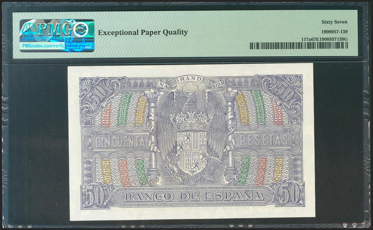 50 Pesetas. 9 de Enero de 1940. Serie D. (Edifil 2021: 437a, Pick: 117a). Muy raro en esta calidad, apresto original. SC. Encapsulado PMG67EPQ.