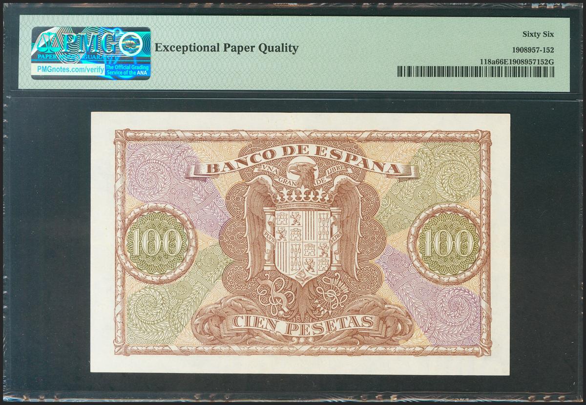 100 Pesetas. 9 de Enero de 1940. Serie A. (Edifil 2021: 438, Pick: 118a). Raro en esta calidad, apresto original. SC. Encapsulado PMG66EPQ.