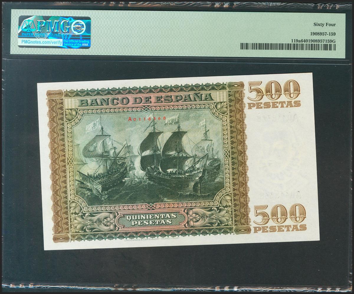 500 Pesetas. 9 de Enero de 1940. Serie A. (Edifil 2021: 439, Pick: 119a). Rarísimo billete sin circular, muy pocos ejemplares conocidos. SC. Encapsulado PMG64.
