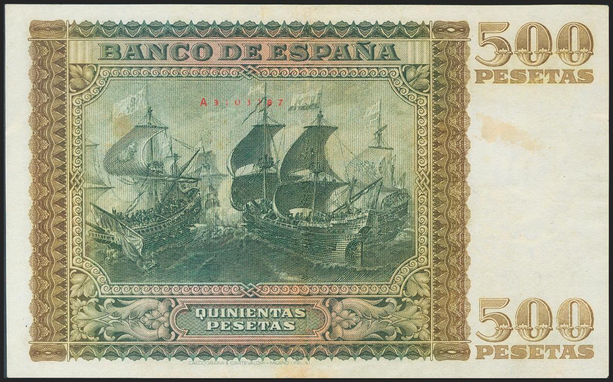 500 Pesetas. 9 de Enero de 1940. Serie A. (Edifil 2021: 439). Mínimamente reparado en el pliegue vertical, atractivo. MBC+.