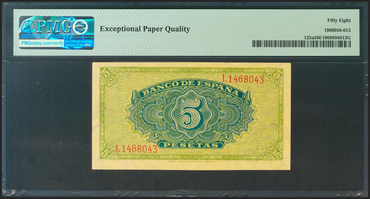 5 Pesetas. 4 de Septiembre de 1940. Serie L. (Edifil 2021: 443a, Pick: 123a). Apresto original. EBC+++. Encapsulado PMG58EPQ.