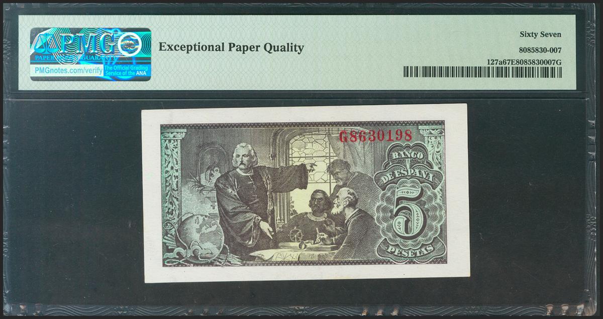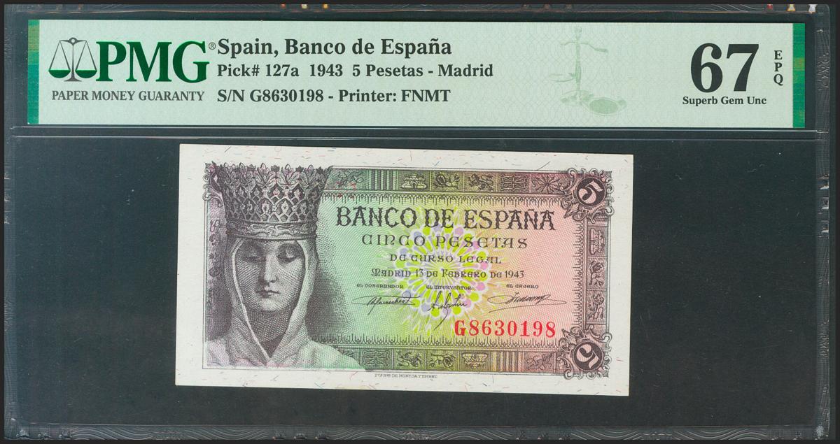 5 Pesetas. 13 de Febrero de 1943. Serie G. (Edifil 2021: 446a). Apresto original. SC. Encapsulado PMG67EPQ.