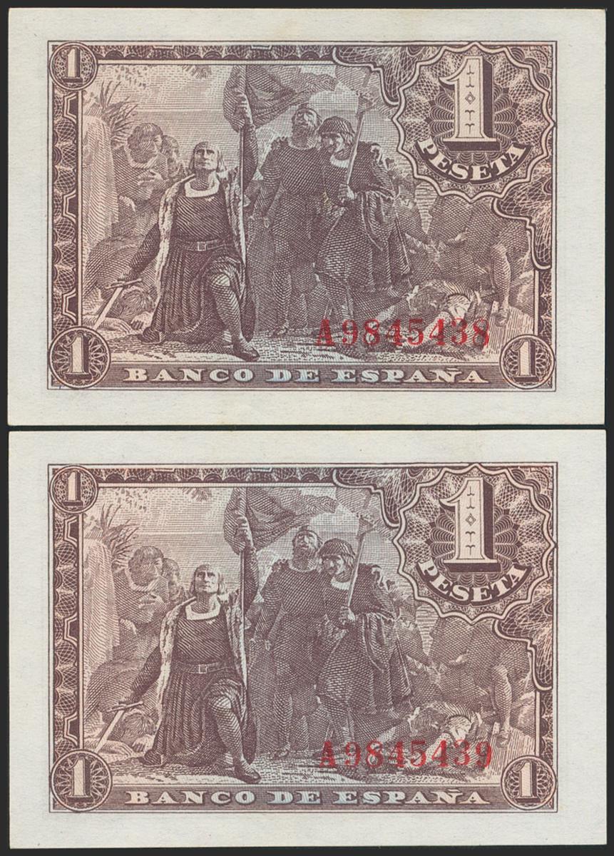 1 Peseta. 21 de Mayo de 1943. Pareja correlativa. Serie A. (Edifil 2021: 447a). Apresto original. SC-.