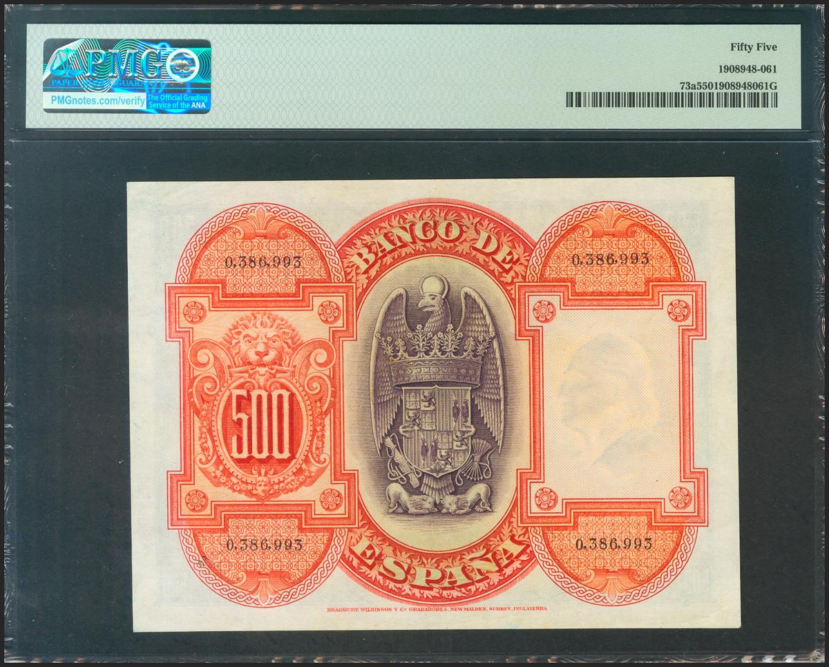500 Pesetas. 24 de Julio de 1927. Sin serie y numeración anterior al 3646000. (Edifil 2021: 327, Pick: 73a). Muy raro, especialmente en esta calidad. EBC+. Encapsulado PMG55.