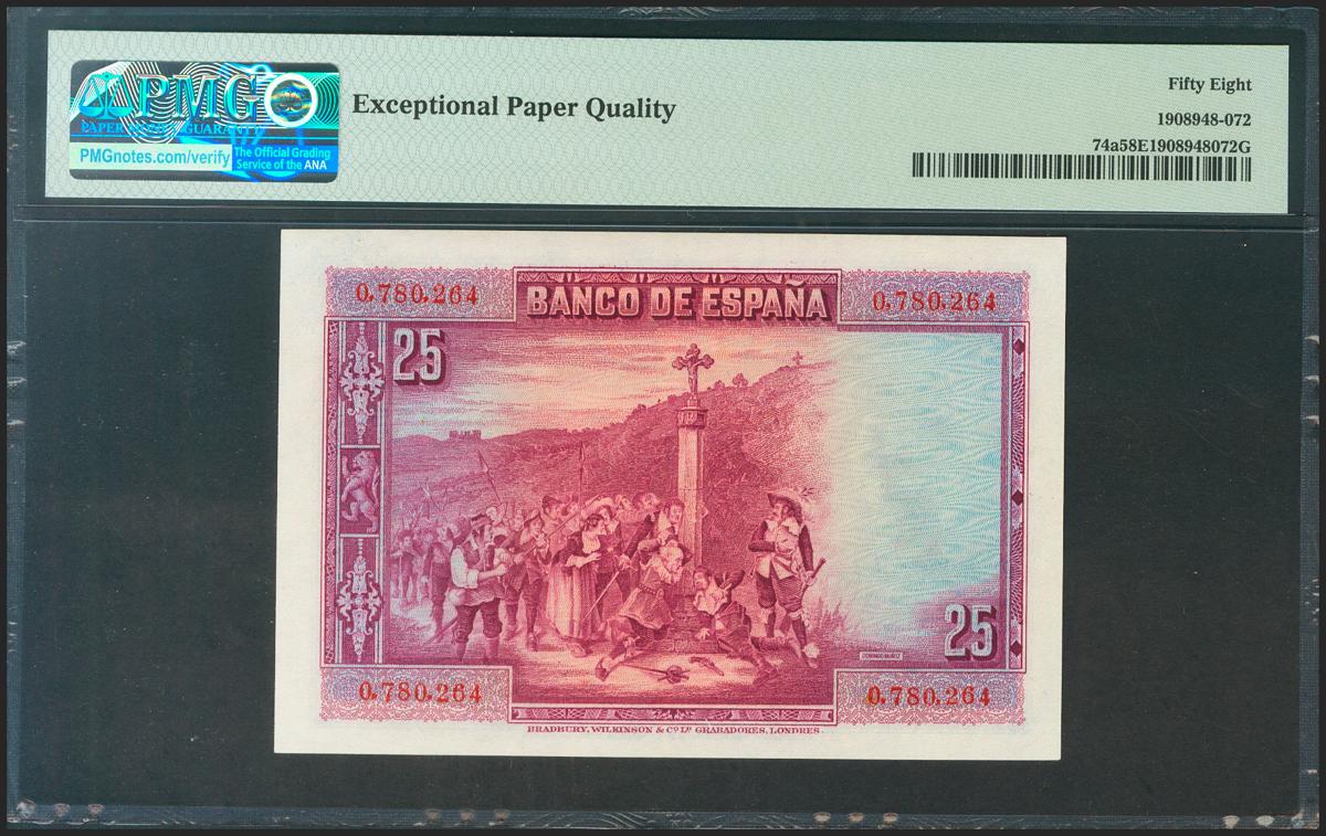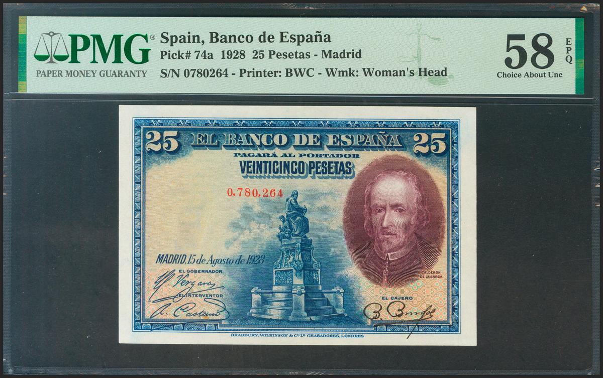 25 Pesetas. 15 de Agosto de 1928. Sin serie. (Edifil 2021: 328, Pick: 74a). Inusual, especialmente en esta calidad y con apresto original. EBC+++. Encapsulado PMG58EPQ.