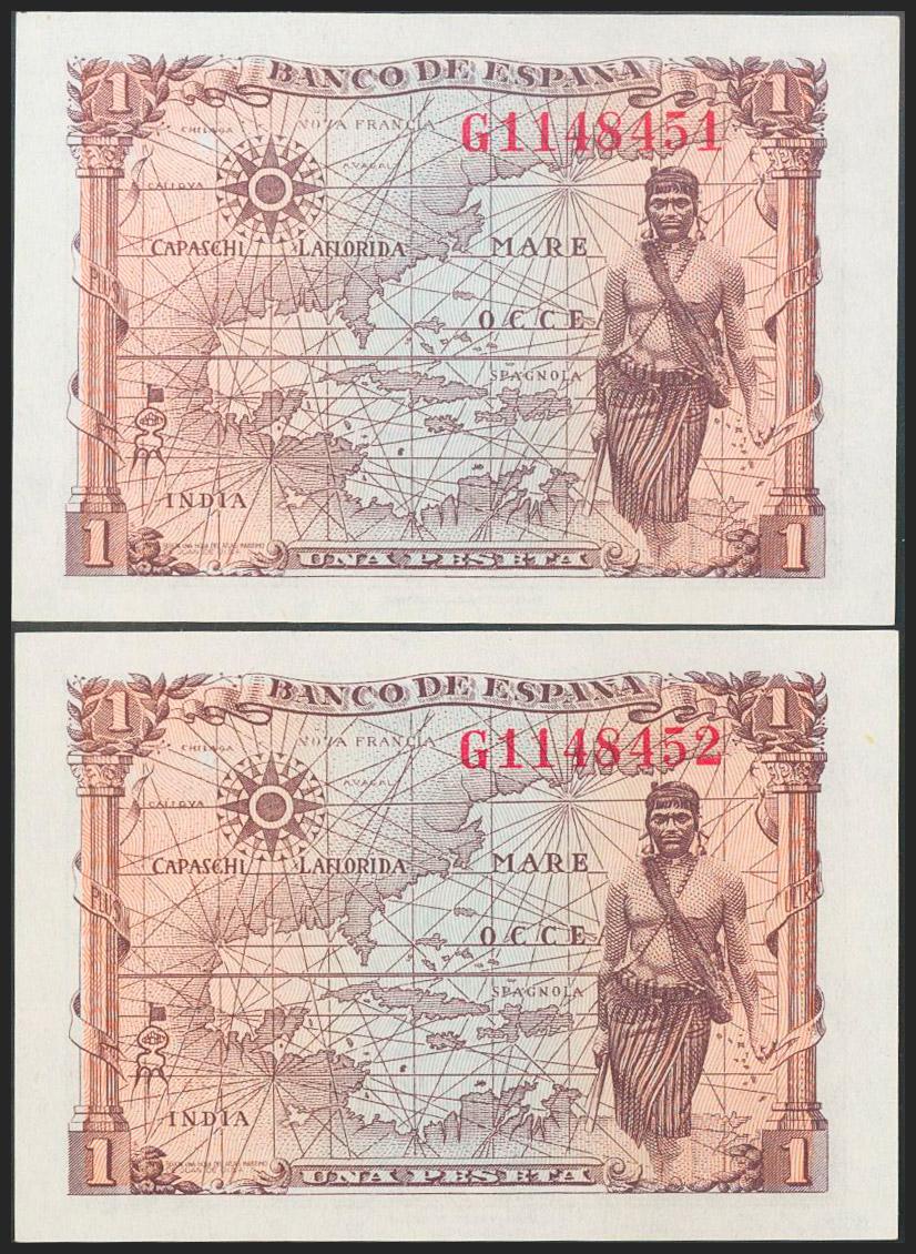 1 Peseta. 15 de Junio de 1945. Pareja correlativa. Serie G. (Edifil 2021: 448a). Apresto original. SC.