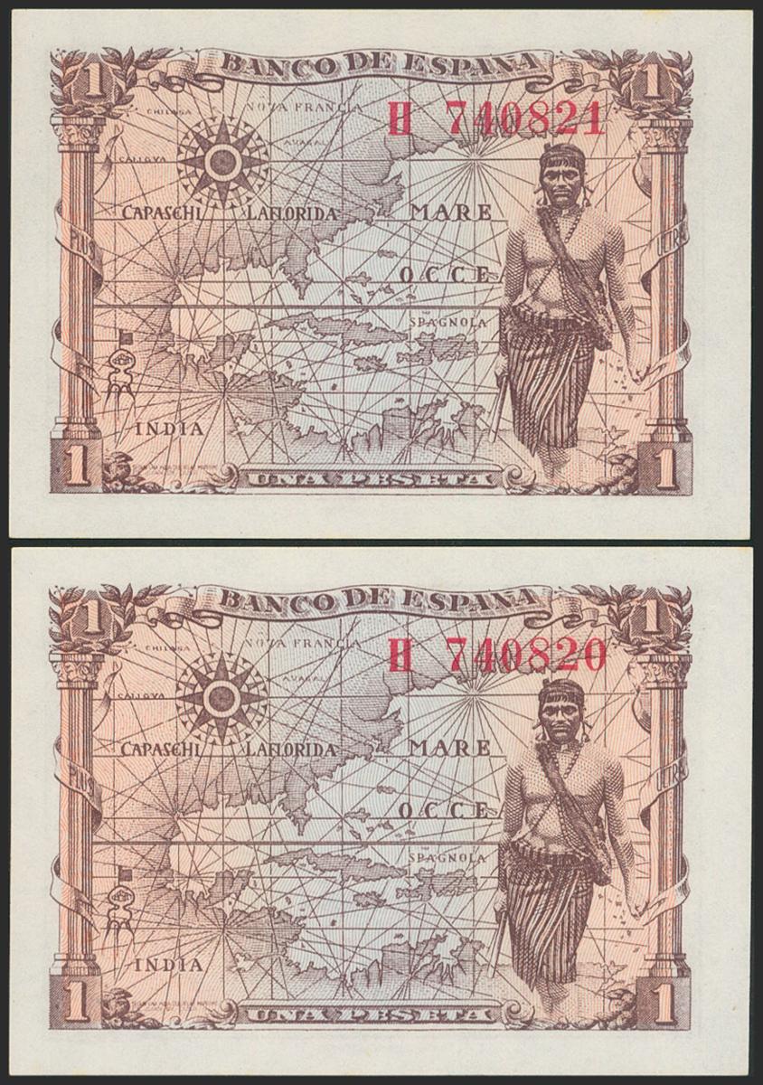 1 Peseta. 15 de Junio de 1945. Pareja correlativa. Serie H. (Edifil 2021: 448a). Apresto original. SC.