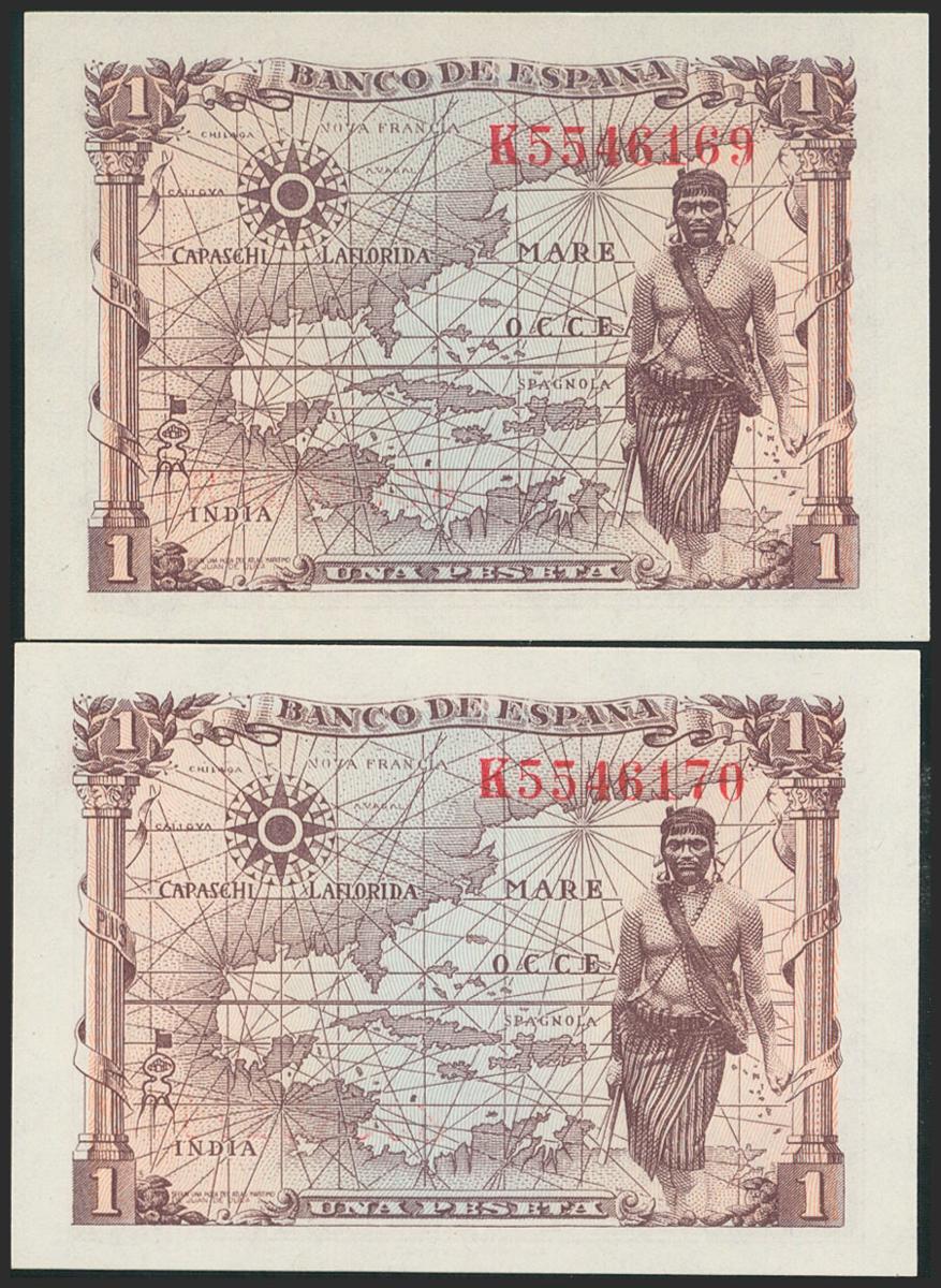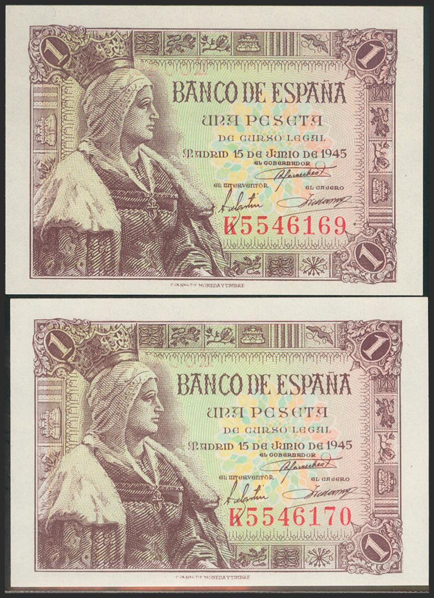 1 Peseta. 15 de Junio de 1945. Pareja correlativa. Serie K. (Edifil 2021: 448a). Apresto original. SC.