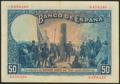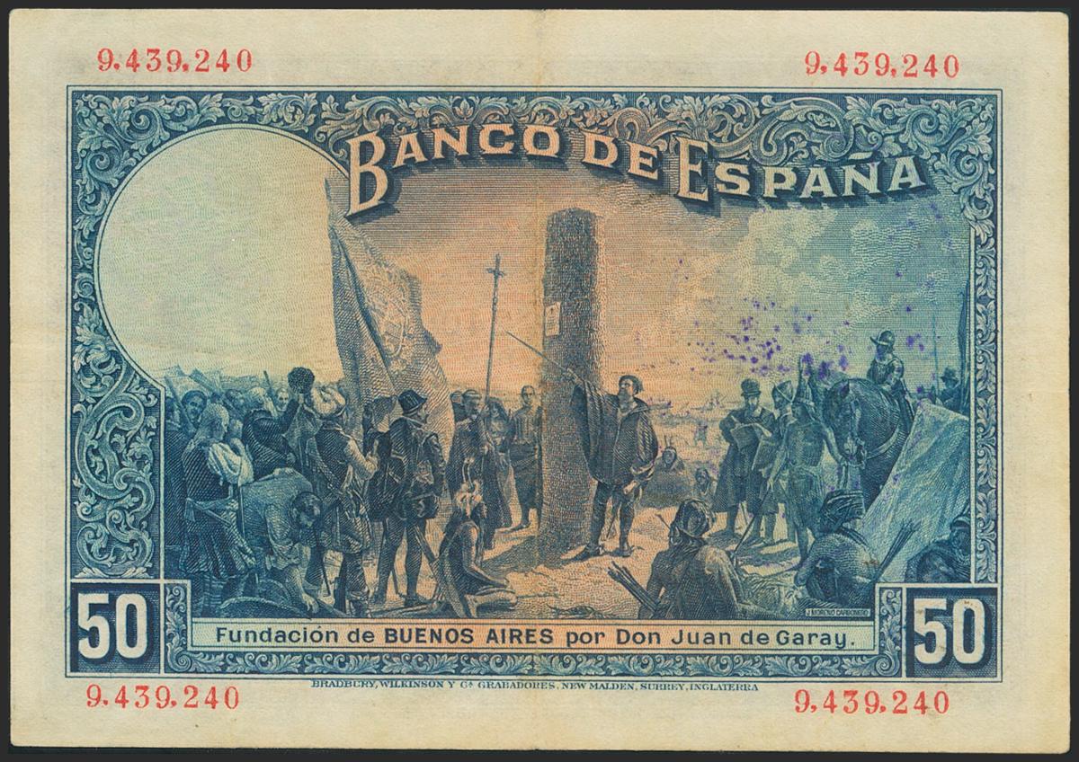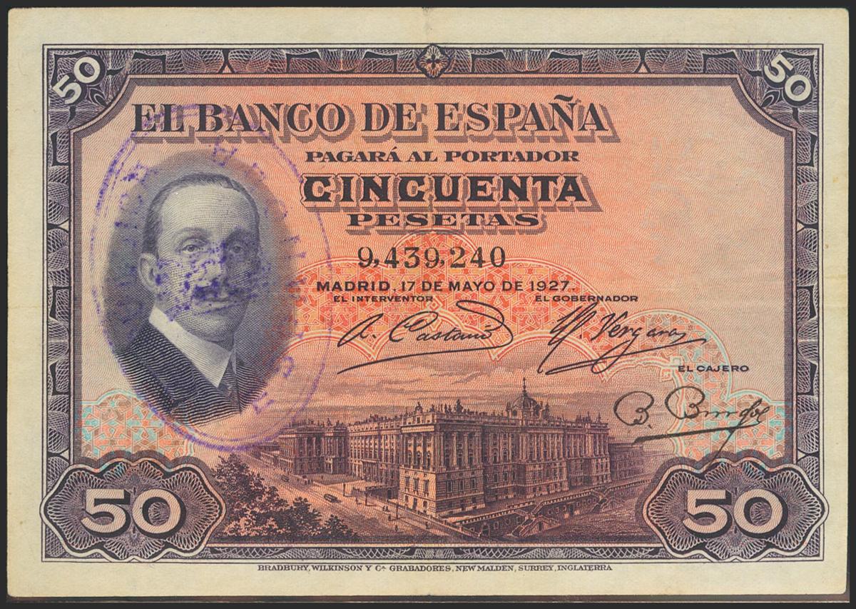50 Pesetas. 17 de Mayo de 1927. Sin serie y sello de caucho REPUBLICA / ESPAÑOLA. (Edifil 2021: 332). MBC+.