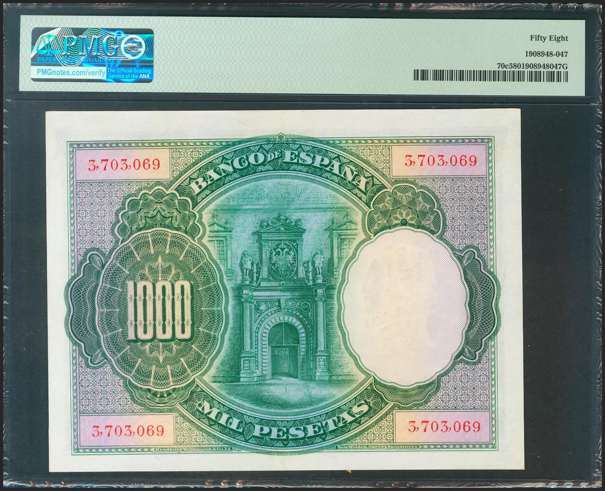 1000 Pesetas. 1 de Julio de 1925. Sin serie y numeración posterior al 3646000. (Edifil 2021: 351, Pick: 70c). Inusual en esta calidad. EBC++. Encapsulado PMG58.