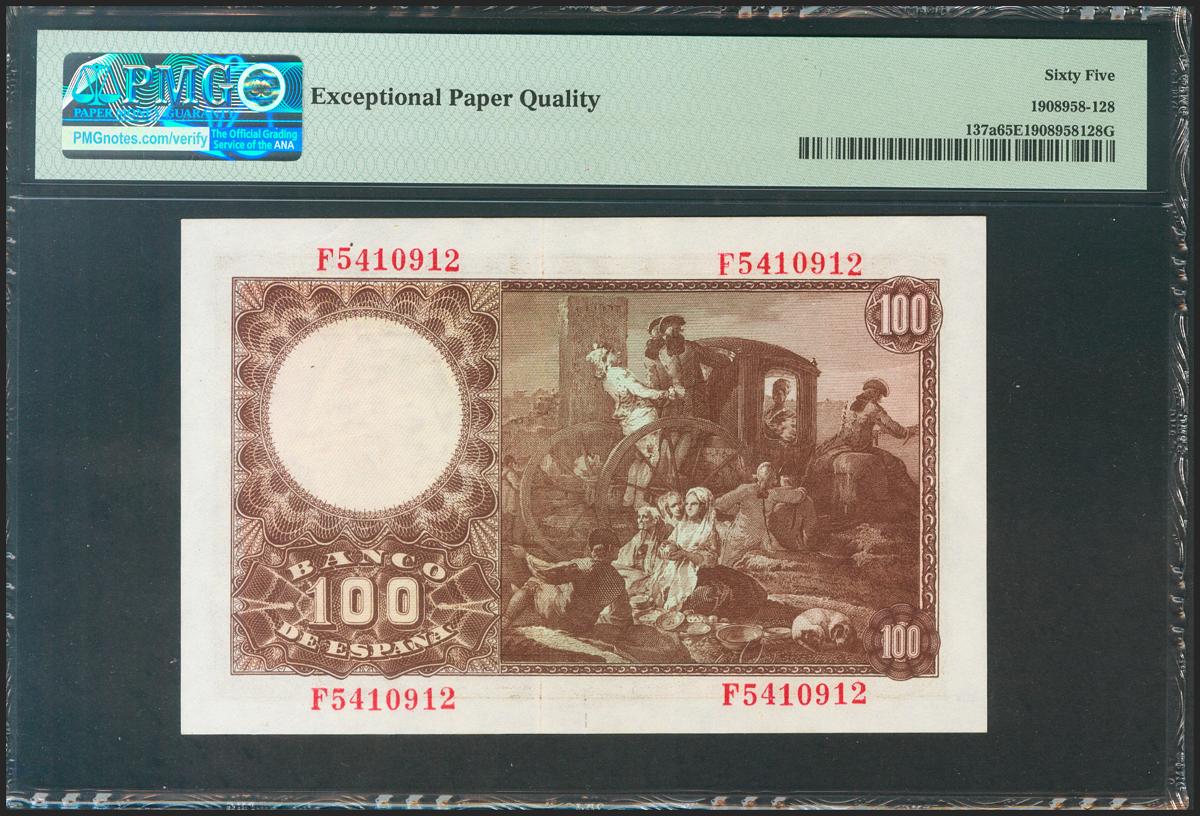 100 Pesetas. 2 de Mayo de 1948. Serie F. (Edifil 2021: 456a, Pick: 137a). Raro en esta calidad, apresto original. SC. Encapsulado PMG65EPQ.