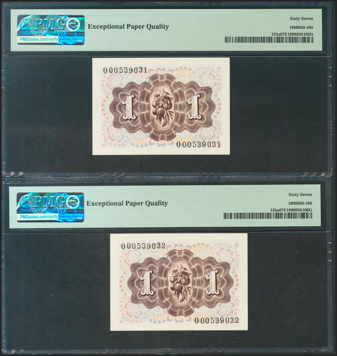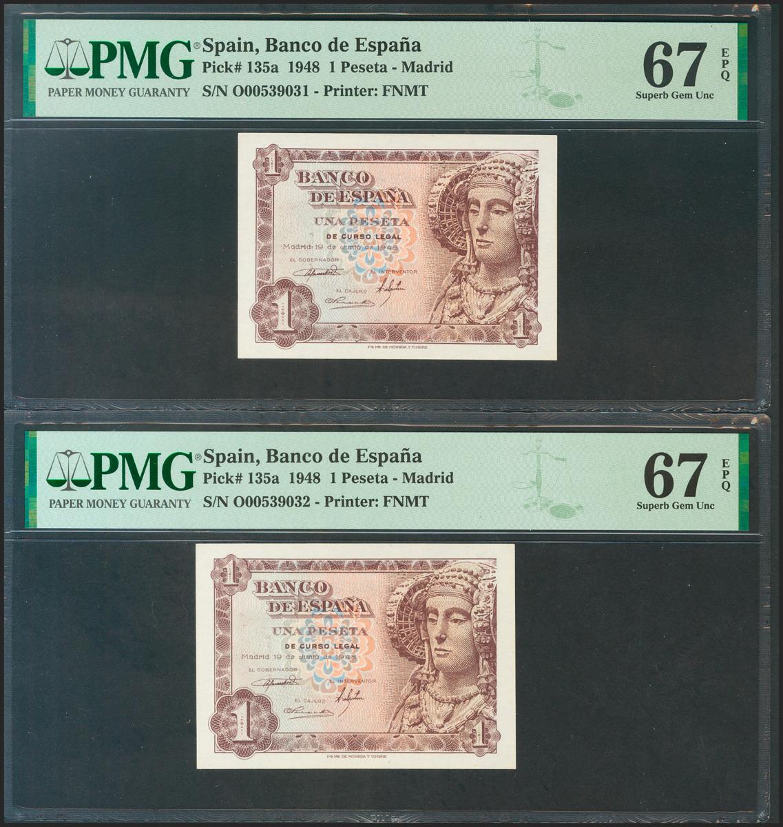 1 Pesetas. 19 de Junio de 1948. Pareja correlativa. Serie O. (Edifil 2021: 457b, Pick: 135a). Rarísima en esta calidad, apresto original. SC. Encapsulado PMG67EPQ, ambos.